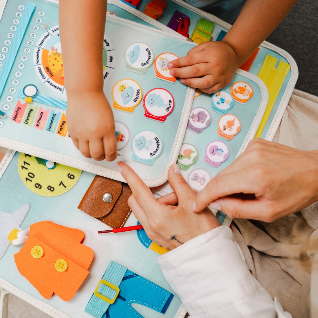 Kinder möchten die ganze Welt „begreifen“. Die 24 Aktivitäten in diesem Busy Board fördern diese natürliche Neugier. Die vielen Einzelteile laden kleine Entdecker dazu ein, die Motorik zu trainieren. Dein Kind lernt wichtige Fähigkeiten für das ganze Leben: Schleifen binden, Emotionen verstehen, Buchstaben erkennen und so viel mehr. Ganz nebenbei trainiert es Soft Skills wie Geduld, Selbstständigkeit, Selbstvertrauen und Fokus.