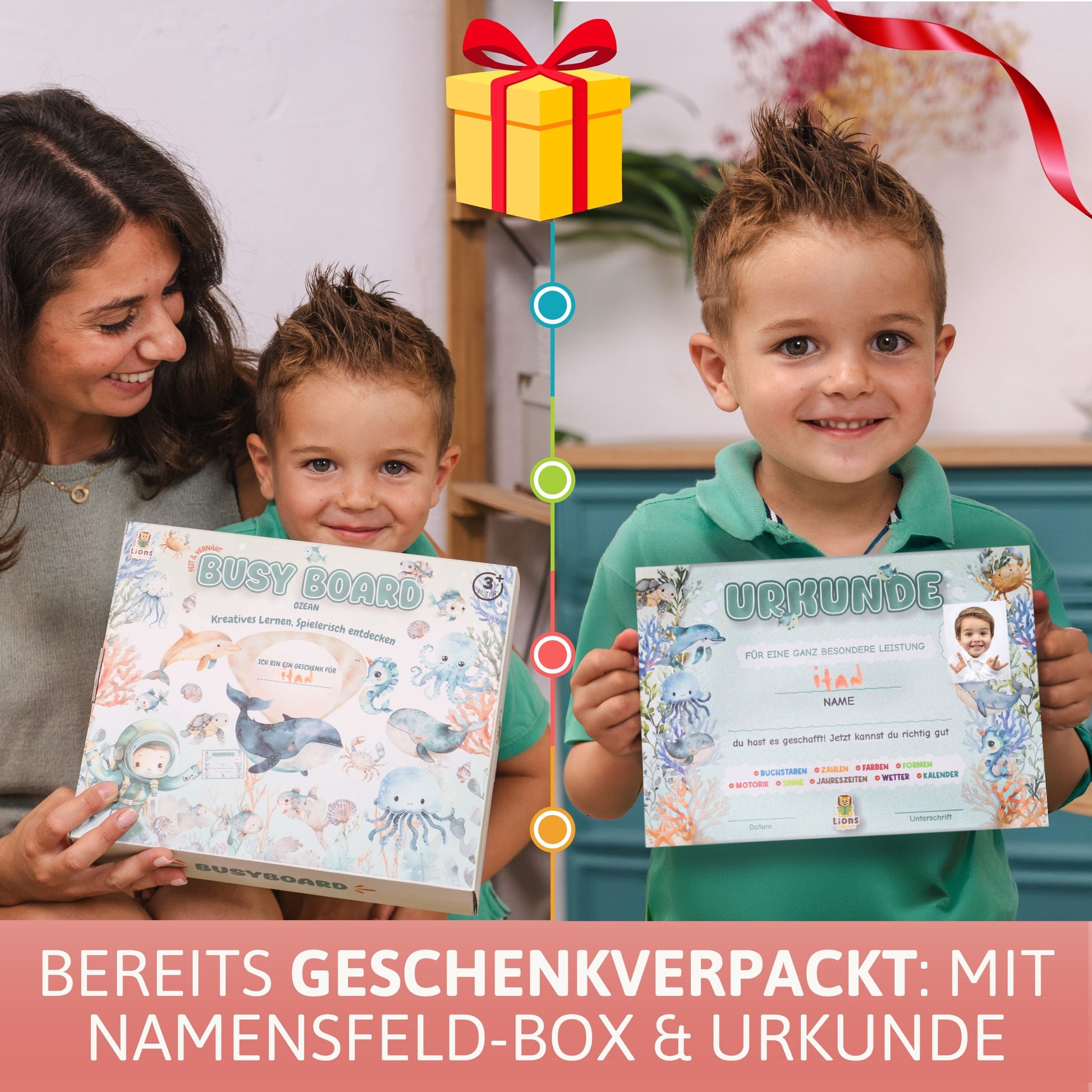 Das Busy Board kommt fertig als Geschenk verpackt bei Dir an. Du ergänzt nur noch den Namen und freust Dich über das Kinderlachen beim Auspacken. Für den Namen ist auch auf dem Busy Board selbst ein Platz vorgesehen. Dadurch wird Dein Sprössling besonders stolz auf sein persönliches Motorikbrett sein.