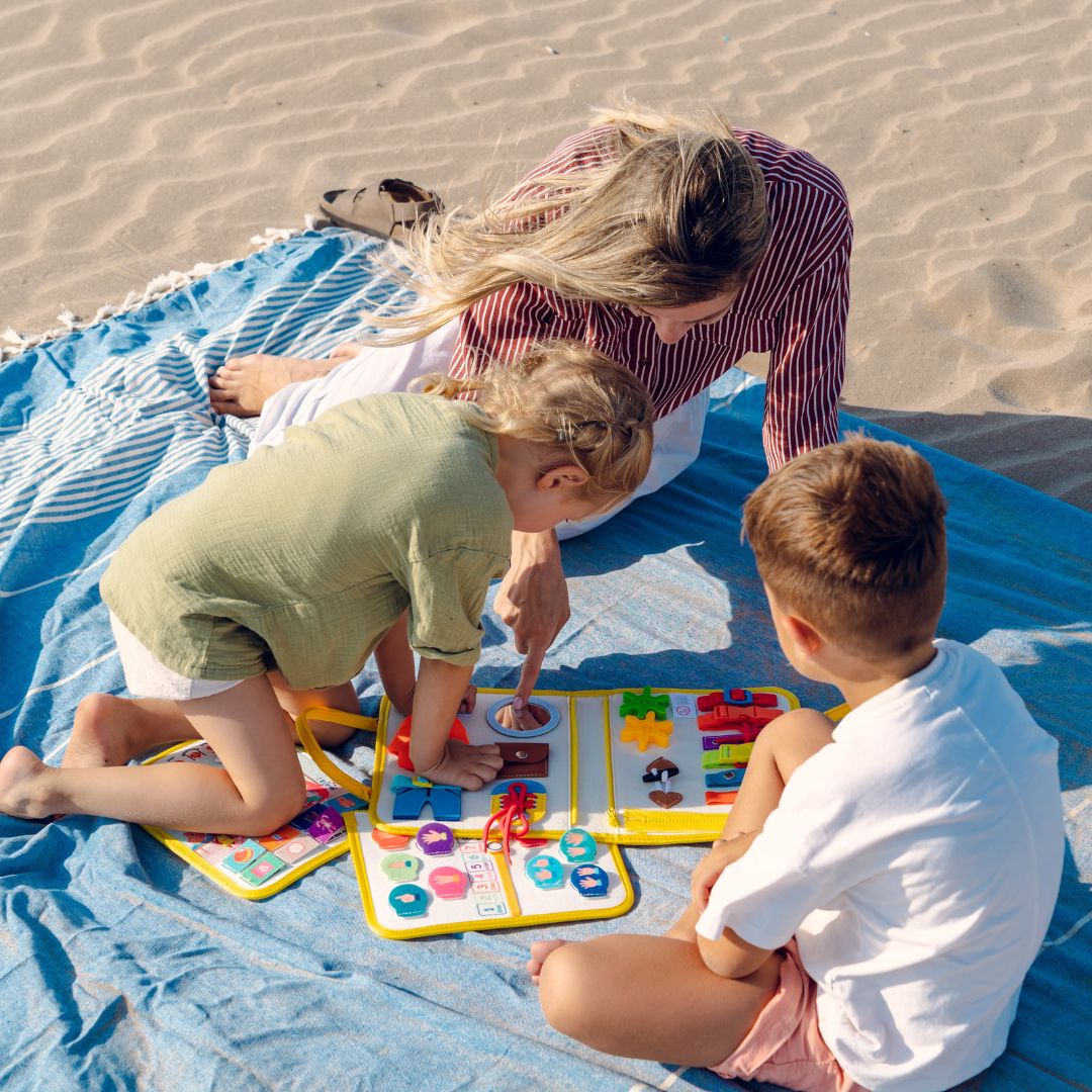 Nicht nur der Teddybär, auch das Busy Board muss in Zukunft immer mit. Ins Flugzeug, in den Zug und ins Auto. Dein Kind beschäftigt sich jetzt auf langen Reisen stillvergnügt mit seinem Aktivitäten-Board. Zur Übernachtung bei Oma und Opa wird es genauso eingepackt wie zum Spielen bei Freunden.