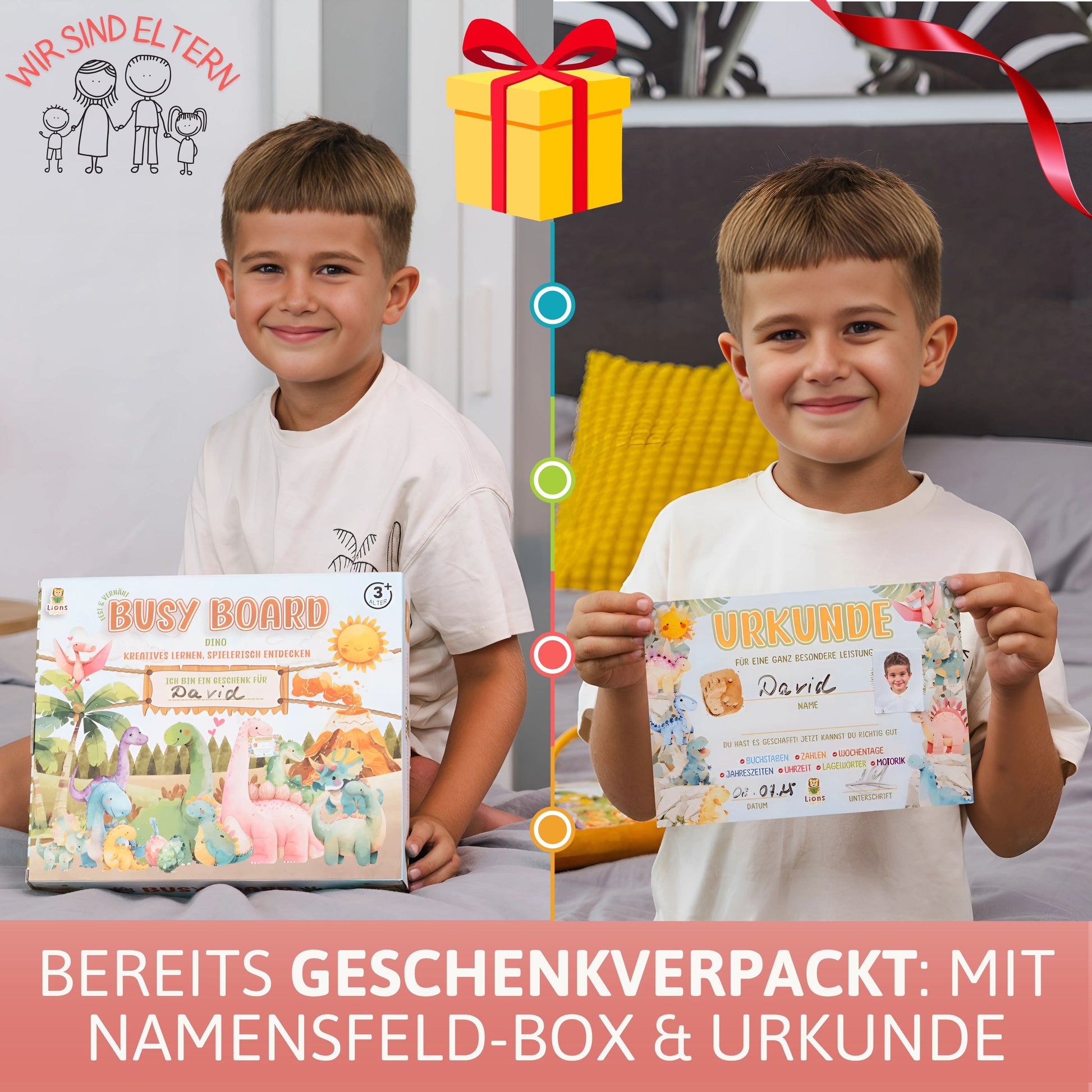 Das Busy Board kommt fertig als Geschenk verpackt bei Dir an. Du ergänzt nur noch den Namen und freust Dich über das Kinderlachen beim Auspacken. Für den Namen ist auch auf dem Busy Board selbst ein Platz vorgesehen. Dadurch wird Dein Sprössling besonders stolz auf sein persönliches Motorikbrett sein.