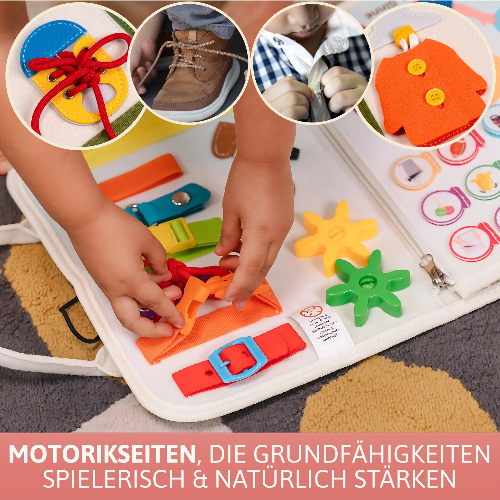 Nicht nur der Teddybär, auch das Busy Board muss in Zukunft immer mit. Ins Flugzeug, in den Zug und ins Auto. Dein Kind beschäftigt sich jetzt auf langen Reisen stillvergnügt mit seinem Aktivitäten-Board. Zur Übernachtung bei Oma und Opa wird es genauso eingepackt wie zum Spielen bei Freunden.