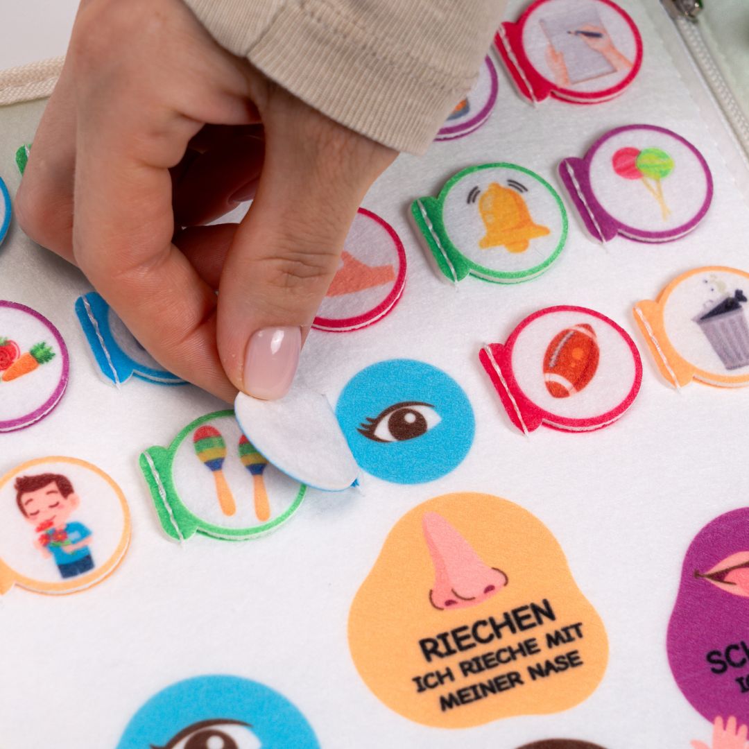 Dieses besondere Busy Board zeichnet sich durch seine fest vernähten Elemente aus. Das macht es zum perfekten Begleiter für unterwegs, da keine Teile verloren gehen können.