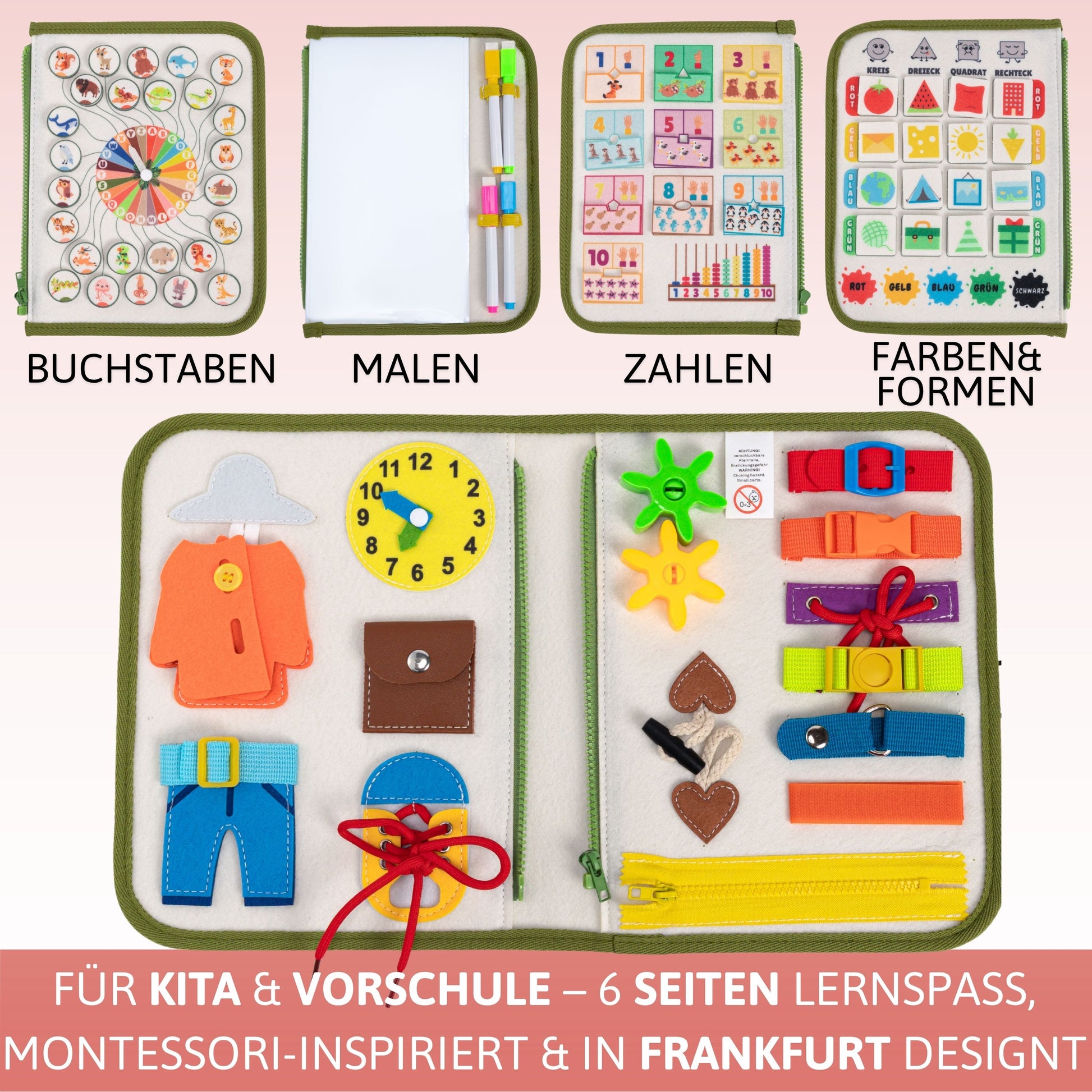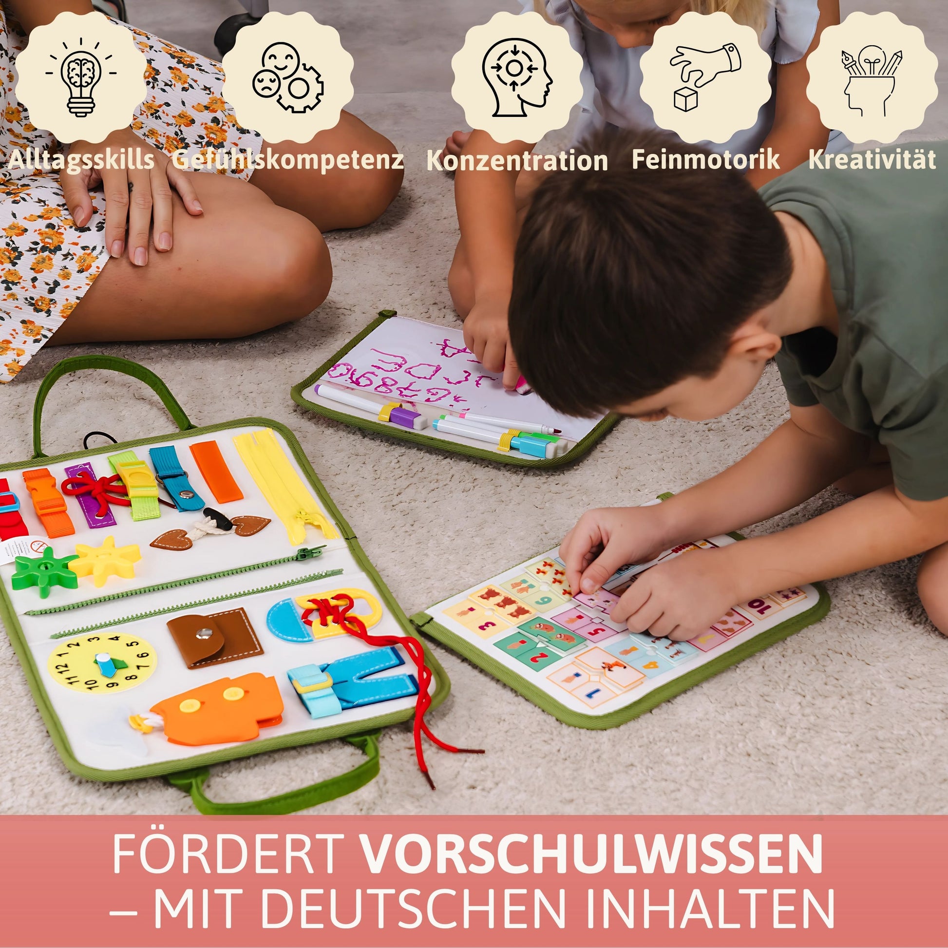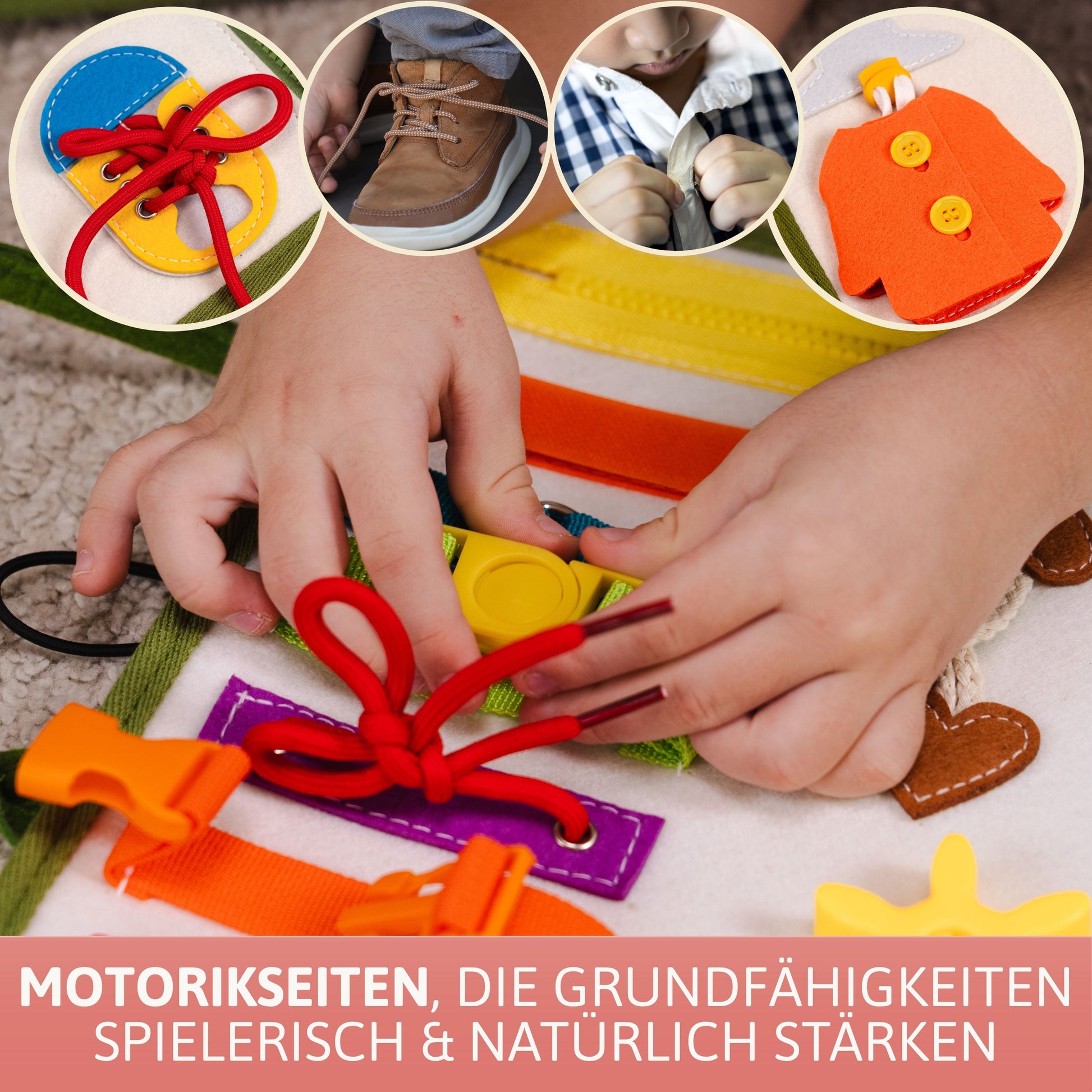 Kinder möchten die ganze Welt „begreifen“. Die 24 Aktivitäten in diesem Busy Board fördern diese natürliche Neugier. Die vielen Einzelteile laden kleine Entdecker dazu ein, die Motorik zu trainieren. Dein Kind lernt wichtige Fähigkeiten für das ganze Leben: Schleifen binden, Emotionen verstehen, Buchstaben erkennen und so viel mehr. Ganz nebenbei trainiert es Soft Skills wie Geduld, Selbstständigkeit, Selbstvertrauen und Fokus.