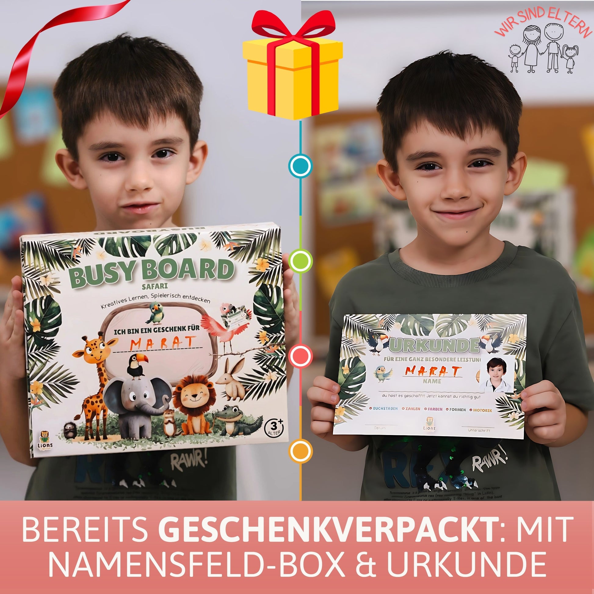 Das Busy Board kommt fertig als Geschenk verpackt bei Dir an. Du ergänzt nur noch den Namen und freust Dich über das Kinderlachen beim Auspacken. Für den Namen ist auch auf dem Busy Board selbst ein Platz vorgesehen. Dadurch wird Dein Sprössling besonders stolz auf sein persönliches Motorikbrett sein.